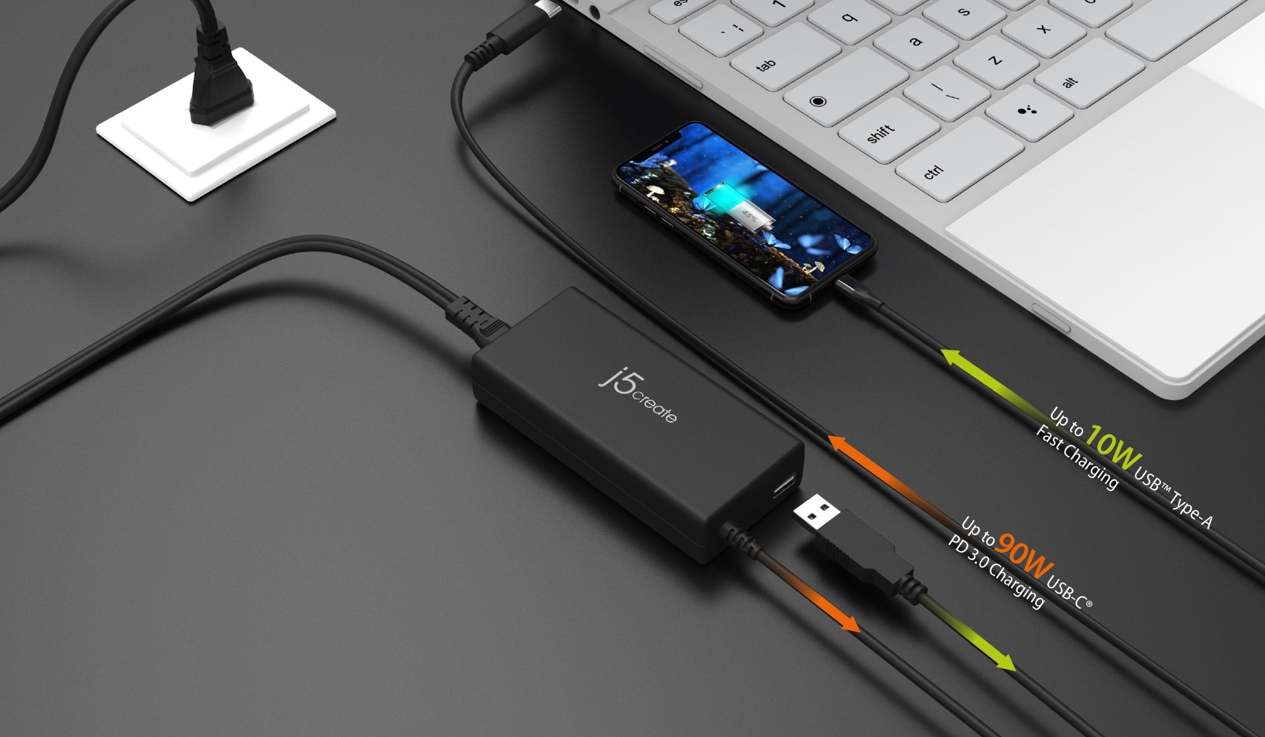 - Кабель USB-C® забезпечує потужність до 90 Вт, а порт USB™ Type-A може забезпечити до 10 Вт
